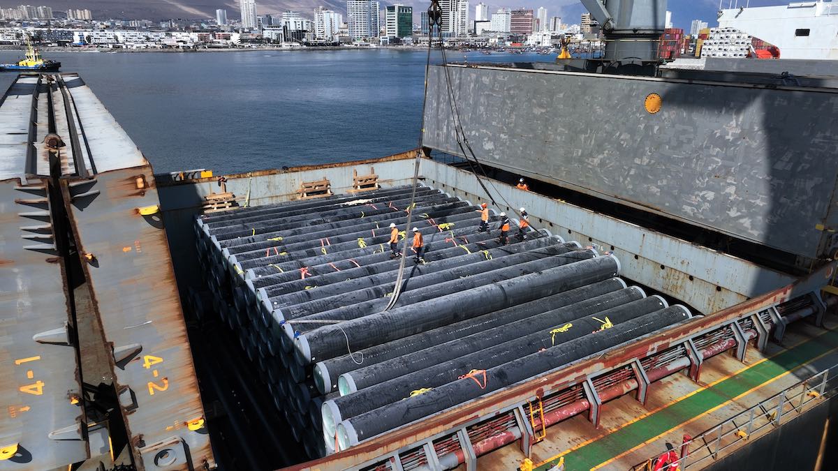 En ese contexto, una nueva transferencia de carga de 2.205 tuberías se efectuó recientemente a través de Iquique Terminal Internacional (ITI), operación logística que se suma a la llegada de 2.195 tuberías en el mes de abril, completando así más de 4 mil tuberías de 15 metros de largo que por primera vez fueron desembarcadas y movilizadas dentro de la región de Tarapacá.