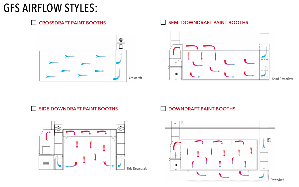 El estilo de flujo de aire impacta directamente en la calidad del acabado, el control de la contaminación y los costos operativos. Para obtener el mejor acabado, se recomienda buscar cabinas que proporcionen flujo de aire laminar.