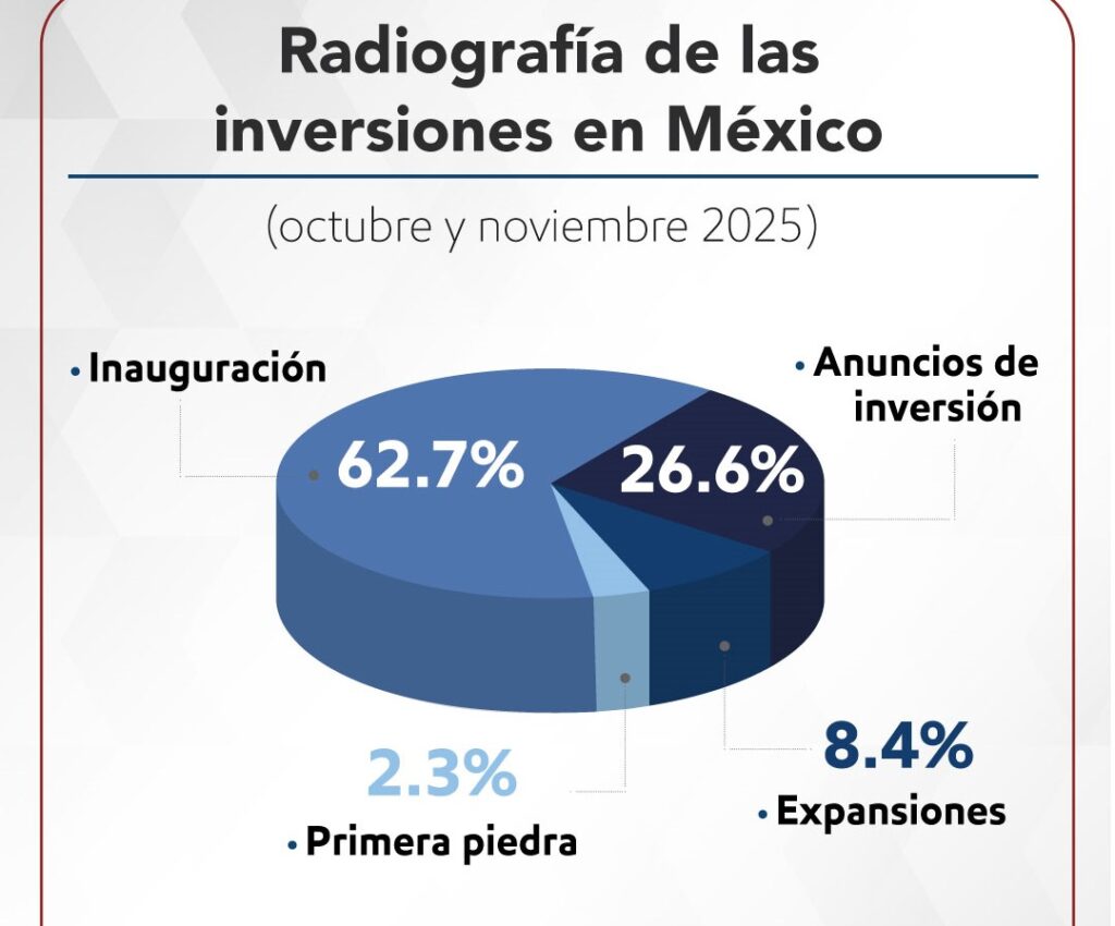 México registró 1,211.25 millones de dólares (mdd) en nuevos movimientos empresariales relacionados con inversiones, entre el 18 de octubre y el 11 de noviembre. Los anuncios de inversión concentraron 321.93 mdd, seguidos por inauguraciones por 760 mdd, expansiones por 102.03 mdd y una primera piedra por 27.28 mdd. La actividad se concentró en Nuevo León y Querétaro, con presencia […]